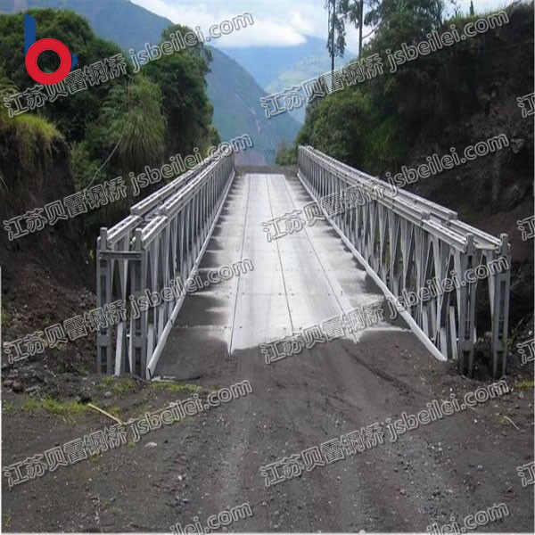 4.貝雷鋼橋斜面弦桿:用于使有加強(qiáng)弦桿的橋梁在推進(jìn)過程中從滾輪上順利通過。分陰頭和陽頭兩種﹔安裝在析架下弦桿的起、止兩端,用銷子和斜面弦桿尾部的彎鉤與加強(qiáng)弦桿、析架連接。
